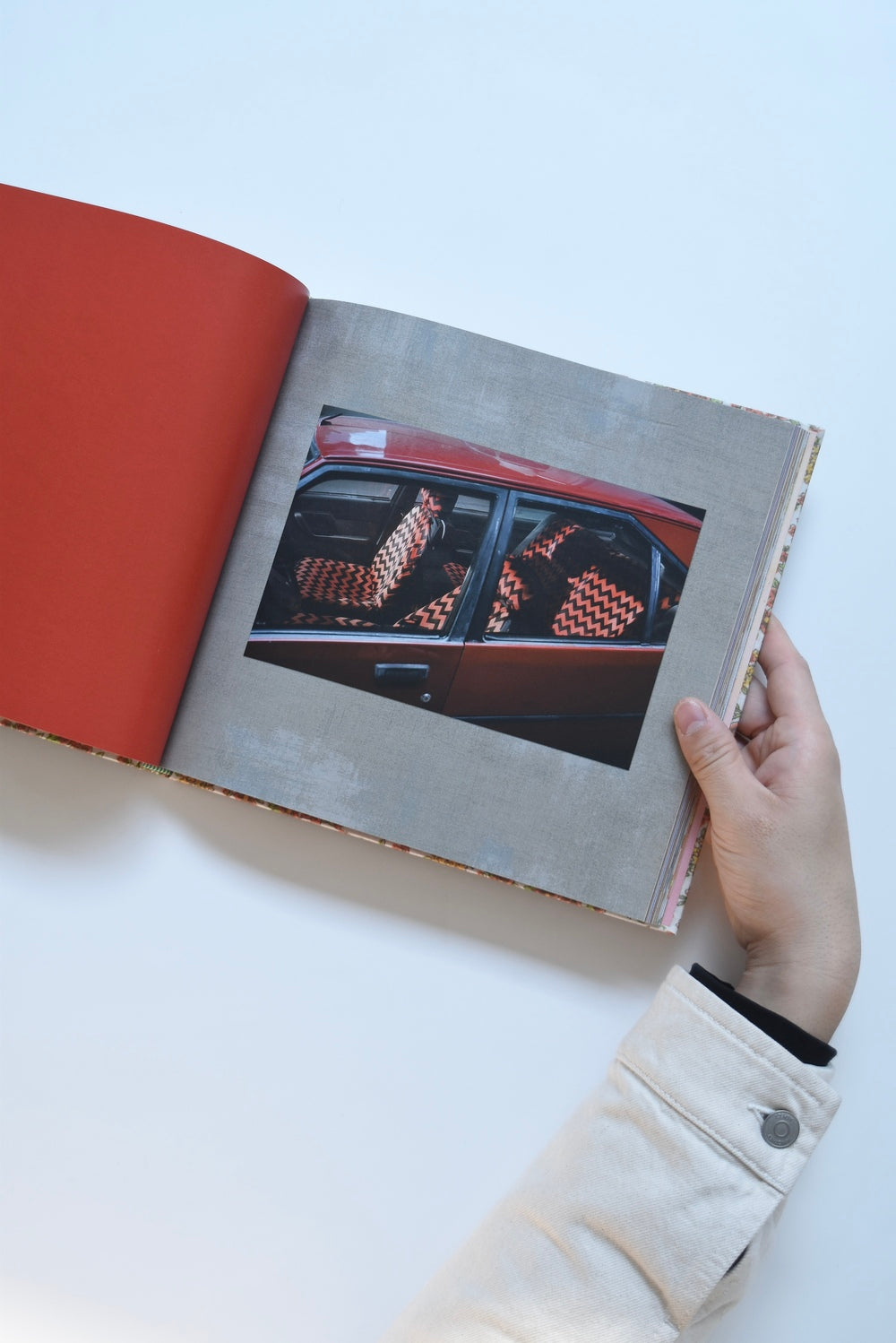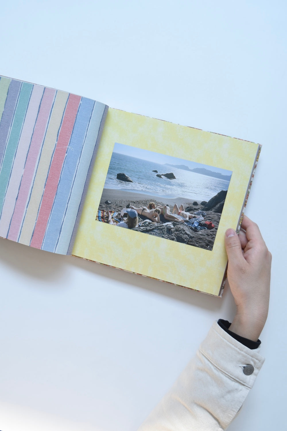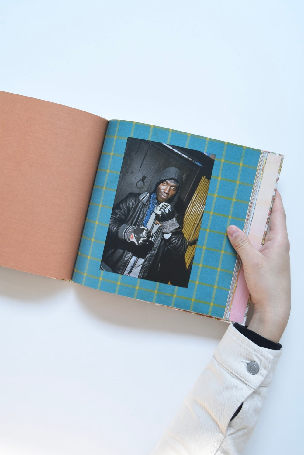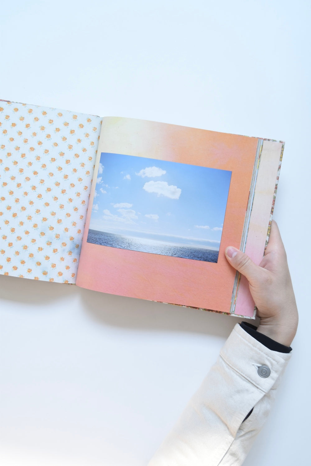 The pages, where vibrant colors and multi-layered textures resonate, depict flowers sprouting in a garden, time spent at a friend's house, moments at the seaside, and sudden silences, depicting the tranquil moments that flow through the photographer's daily life. The patterns on the fabrics overlap as if they were fragments of these scenes, creating a visual harmony and a poetry of chance.